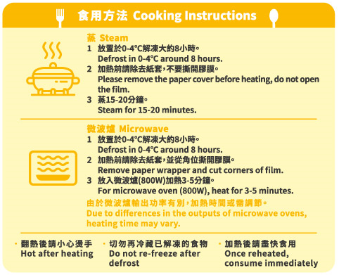 ‧ 急凍貯存。解凍後微波爐及蒸煮翻熱後即食